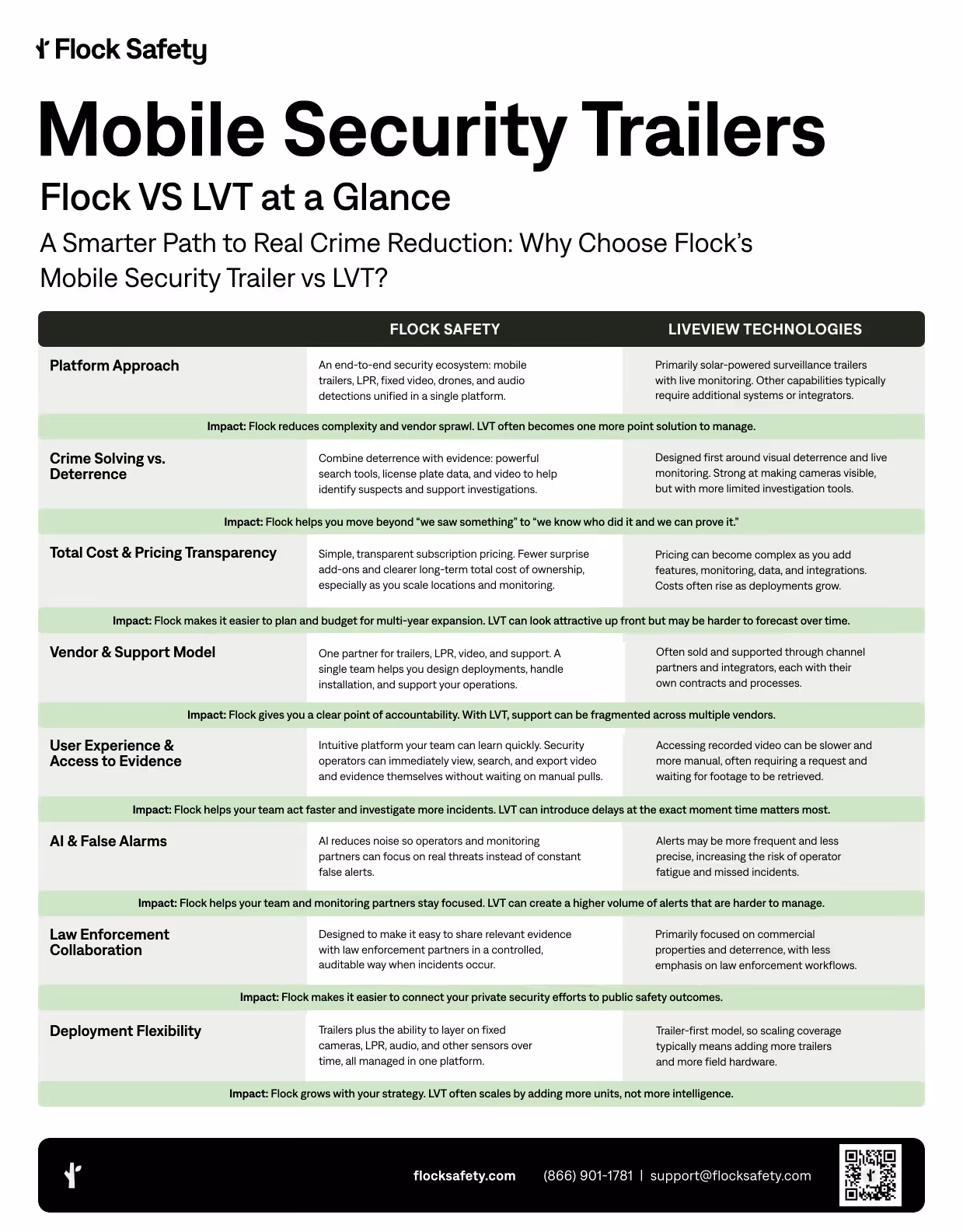 This side-by-side comparison details why Flock is the clear choice for a mobile security trailer compared with LiveView Technologies (LVT).